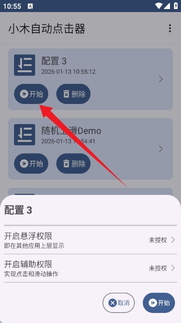 4、返回主界面,找到刚保存的“配置3”任务,点击其“开始”按钮,系统会弹出权限请求对话框,提示需开启悬浮窗权限,才能在其他应用上层显示操作界面。