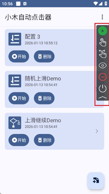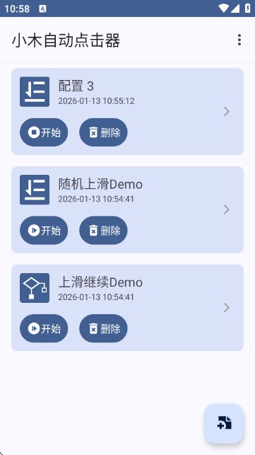 2、进入主界面后,可看到已创建的自动化任务列表,如“随机上滑Demo”“上滑继续Demo”,每个任务均配有“开始”和“删除”按钮,点击右下角加号图标可添加新任务。