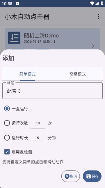 3、点击加号图标进入任务配置页面,切换至“简单模式”标签,可设置任务标题(如“配置3”),选择运行方式(一直运行、运行次数或运行时长),还可启用反检测功能,完成设置后点击“保存”即可。