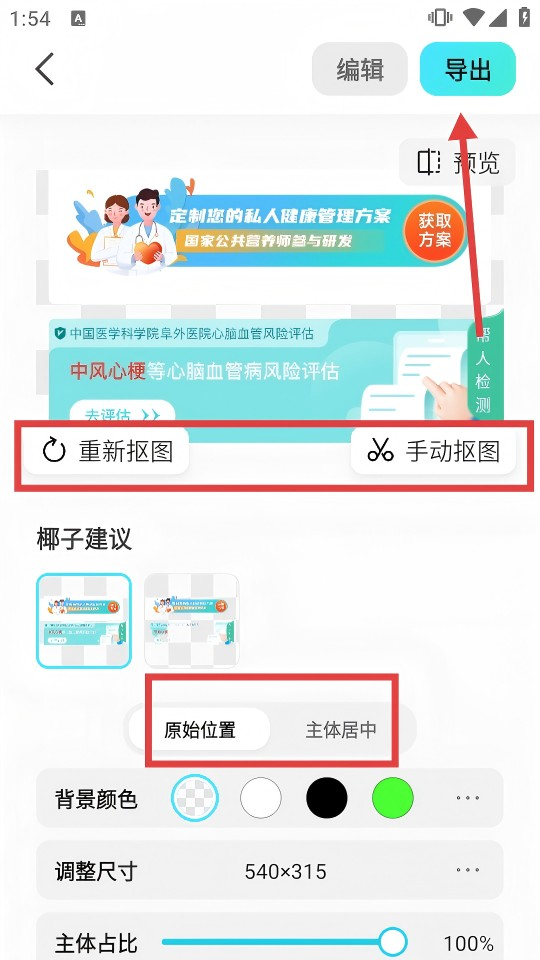 4. 抠图完成后,可根据需求选择“重新抠图”或“手动抠图”调整细节,调整好位置后,点击右上角“导出”即可保存抠图结果。