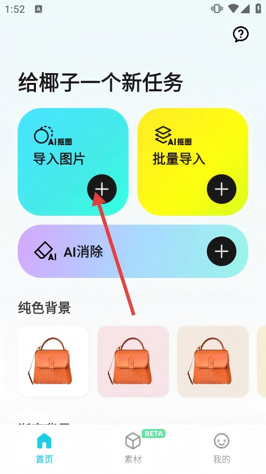 1. 打开椰子背景app,进入首页后,找到“ai抠图”板块,点击“导入图片”旁的加号,添加需要处理的图片。