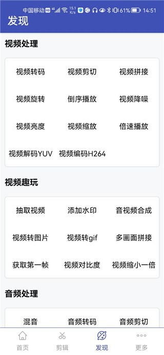 4、点击发现板块,包含多种视频处理功能,涵盖转码、剪切、拼接等多种操作。
