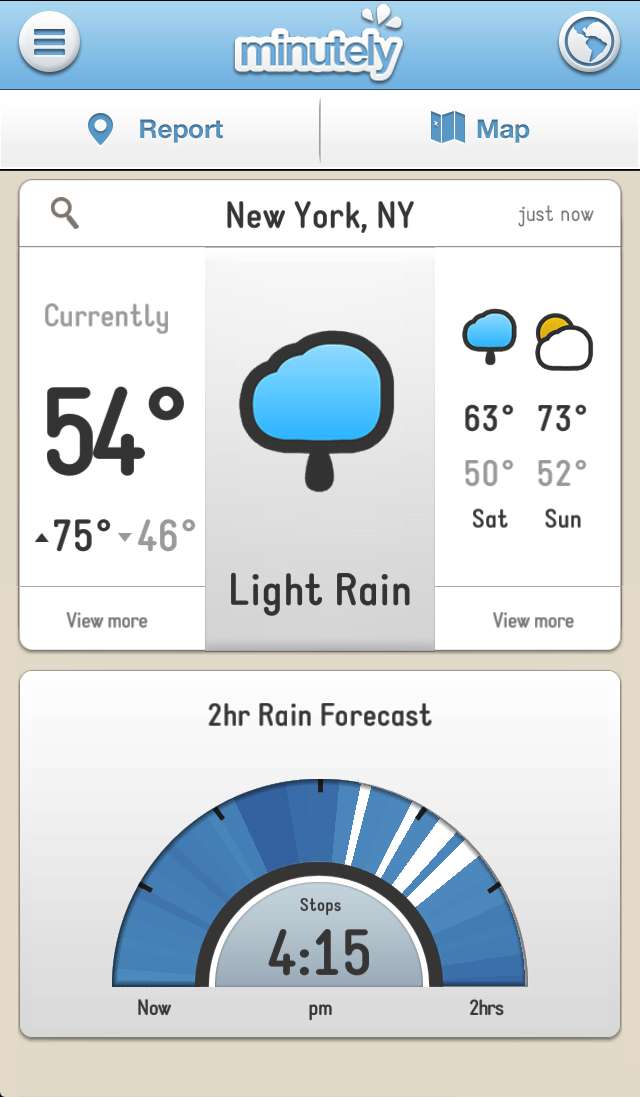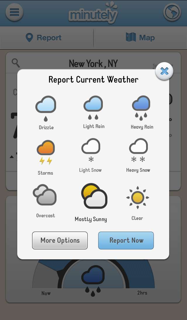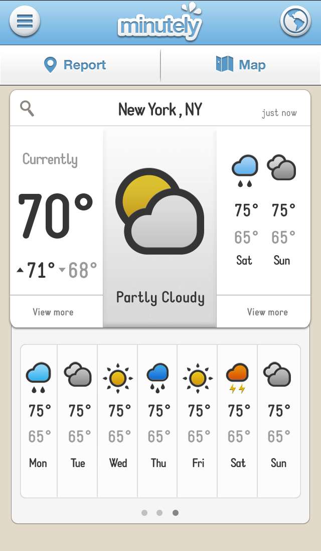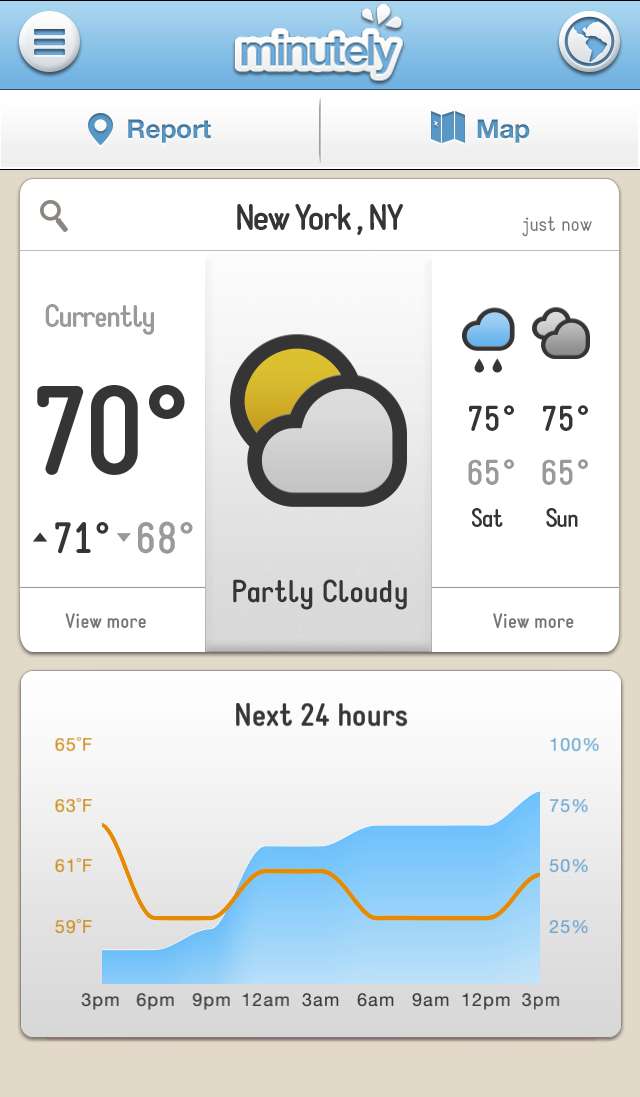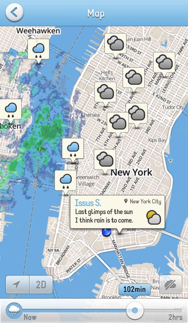Minutely 是一款很有特色的应用,它将天气报道和预测行为以众包的形式交给每一个使用它的用户,同时App 使用3D 特效来模拟地区的天气情况。