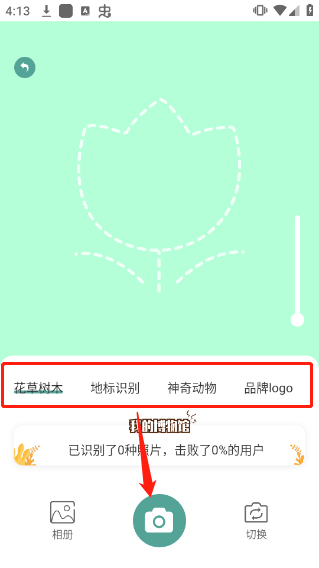 2、扫一扫功能主要通过不同引擎识别具体花朵,我们可在下图所示位置切换如“花草树木”、“地标”、“动物”等各项引擎