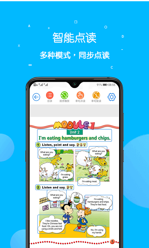 课本内容准确定位,单句点读、单句复读、顺序播放、智能翻译等功能