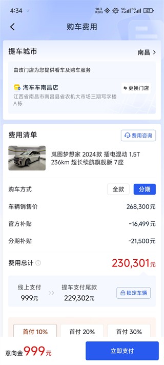 5、可查看车辆相关费用,根据自身情况选择分期或全款方式完成购买。