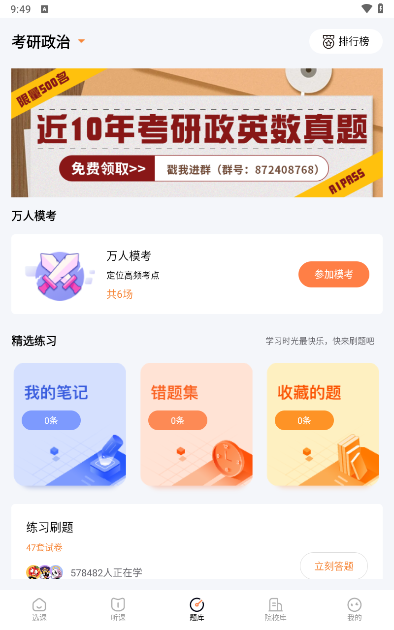 6、题库界面可进行刷题练习,巩固所学;