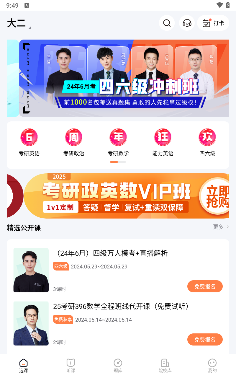 2、精品课程:涵盖考研、英语学习等丰富课程,覆盖大学生学习成长全程。