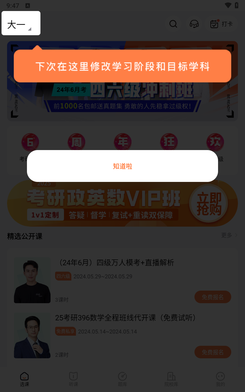 3、首页可以修改所在年级;