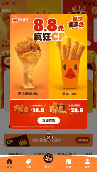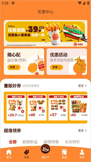4.三合一优惠券:官方正版优惠券轻松获取,且仅汉堡王APP内的优惠券可同时用于到店消费和外卖订单,实用便捷。