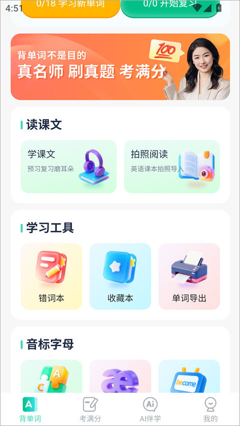五大模块形成完整的闭环训练体系,帮助你巩固背单词成果,轻松应对考场听力,有效培养英语语感,深入吃透单词用法,将词汇量真实转化为卷面分数。