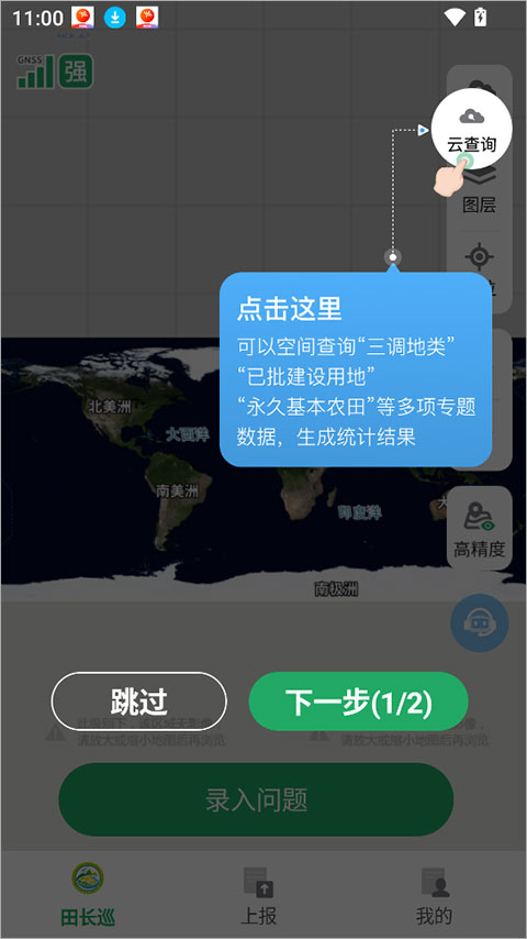 4、注册登录完成后,即可正式开启农田巡视管理工作。app功能十分丰富,例如“云查询”功能可以查询三调地类、已批建设用地、永久基本农田等多项专题数据,并自动生成统计成果。