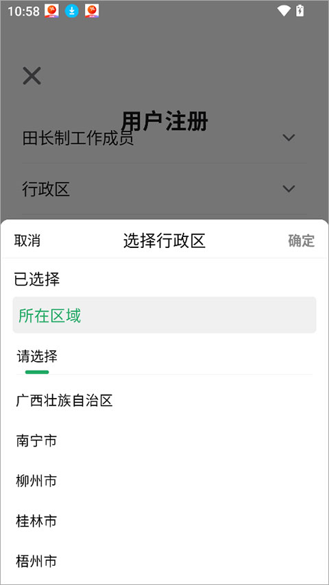 2、注册时需要选择所在的行政区域。
