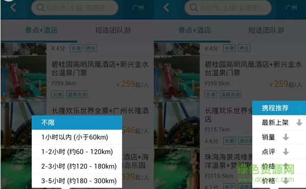 进入“短途游”功能后,用户可以在底部选择不同的搜索条件,如:旅行的路程、旅游套餐的价格等等。