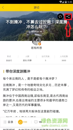 2、然后,我以云南为例,点击下面的一篇云南旅游攻略,然后点击右上角的“分享”按钮,即可进行分享;