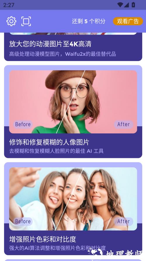 1、打开画质 2X 最新版本,主界面展示多种功能,包括动漫图片放大至 4k、修复模糊人像等;