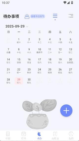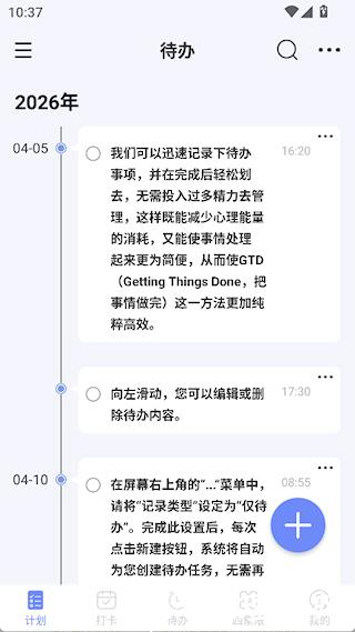 1、计划界面按时间顺序排列待办事项,点击+添加新的待办