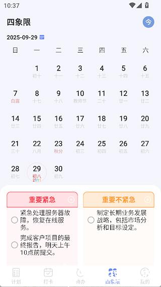 2、四象限分类机制:依据紧急与重要双维度划分任务象限,建立科学的任务处理节奏,规避优先级混淆问题。