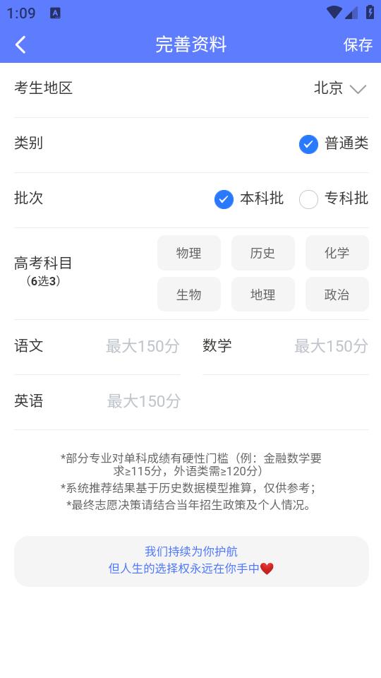 2、进入软件后,点击 “完善信息” 入口,按提示填写个人基本信息、高考相关数据(如预估分数或实际分数、所在省份、选考科目等),确保信息准确以提升推荐精准度;
