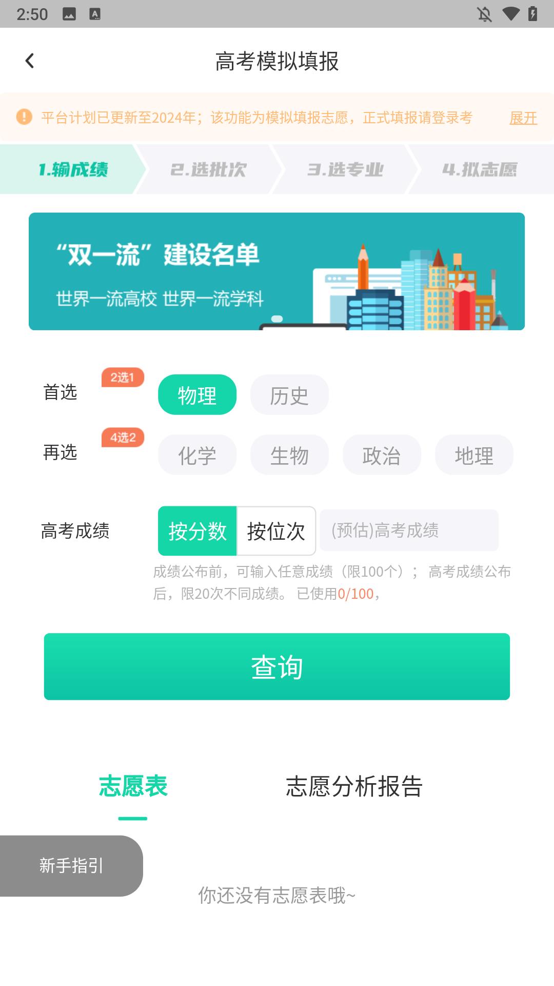 2、找到并点击 “高考模拟填报” 功能,先选择自身所属学科类别(如普通文理、艺术等),准确填入高考分数(或预估分数)后点击查询,启动模拟分析;