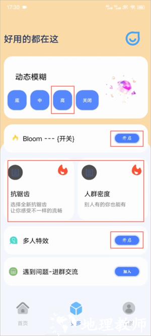 4、进入 “更多” 页面,找到并开启特效、动态模糊等功能选项,部分版本还支持开启人群密度显示;