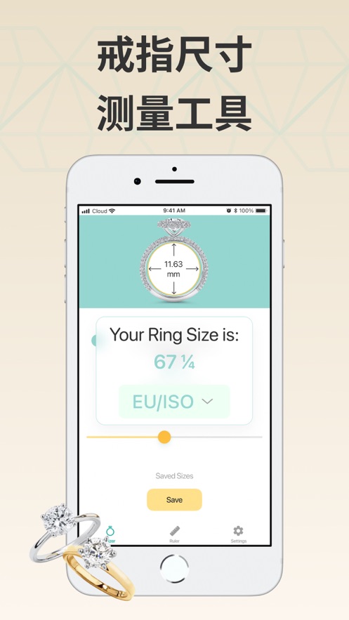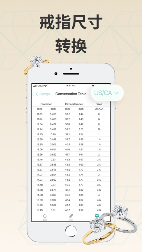 3. 软件内置多种类型的戒指样式和各国尺码单位,方便用户进行随时转换和对比。