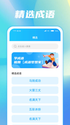 2. 学习内容:成语梦想家的学习内容丰富多样,不仅包括成语的解释、例句和用法,还有成语故事和背景知识,有助于用户更深入地理解成语的含义和用法。