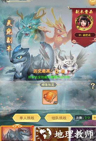 通关主线200关开启灵宠副本。玩家拥有两次收益次数,通关副本会消耗收益次数获取丰厚奖励。灵宠副本可以组队也可以单人挑战,最多支持3人组队,副本有多种难度,难度越高收益越高,副本限时战斗,在限时内通关当前难度后开启下一个难度。战斗中,队友战斗失败可使用技能复活队友,当场上玩家全部阵亡,战斗立即结束并结算奖励。战斗中玩家可以消耗仙玉释放副本技能提升伤害,技能效果全队共享,重复释放技能效果不叠加。