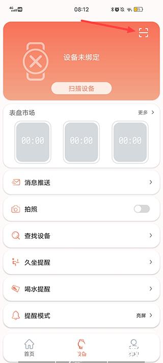 1、启动RDFit智能手表完成注册登录后,选择设备界面右上角的扫描区域