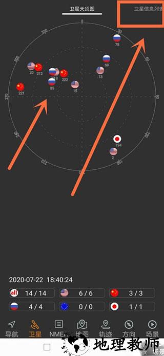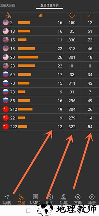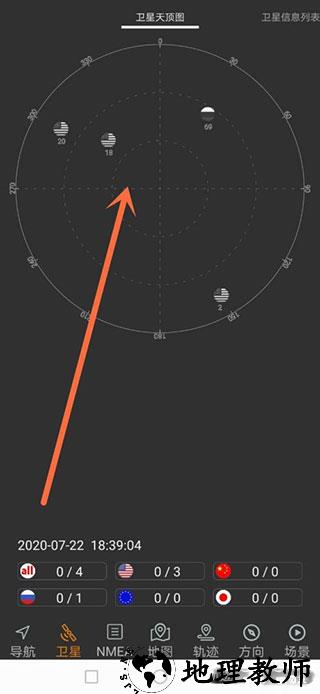 3、查看卫星状态:点击底部【卫星】按钮,进入卫星界面后停留几秒,系统将自动显示可见卫星数量、信号强度及分布情况;点击右上角【卫星信息列表】,可查看北斗、Gps 等各国卫星的具体数量、坐标纬度等详细数据。