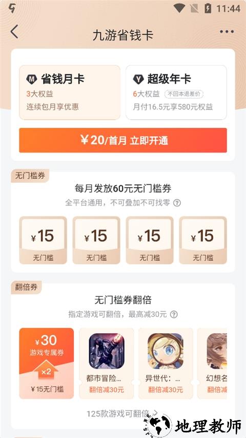 2、选择开通省钱月卡或年卡,开通后可获得指定游戏的翻倍专属券,用于充值时抵扣。