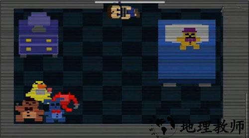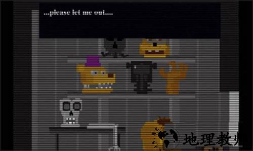 初始进入游戏后发现一个小男孩被人锁在屋内,屋内还有黄金泰迪熊和前几代的玩具熊:佛雷迪熊、奇卡鸡、邦尼兔、海盗狐狸,小男孩尝试出去但做不到。
