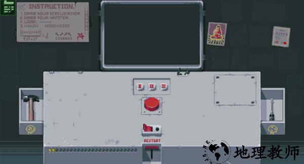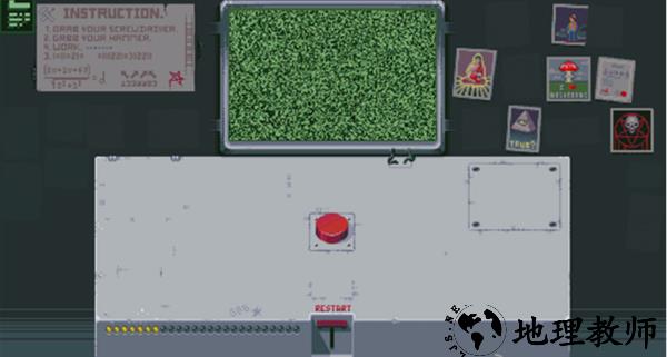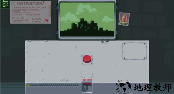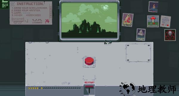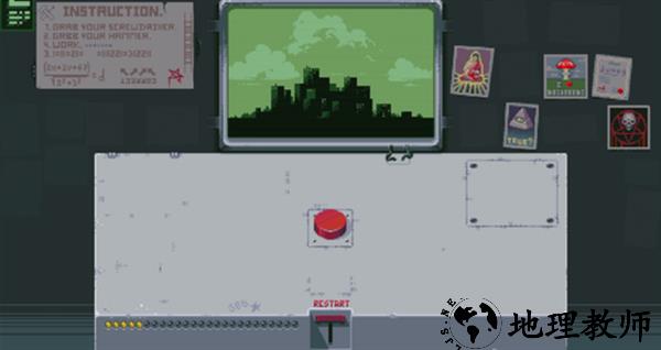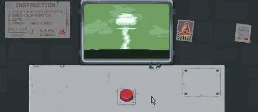 3.第三盏灯:先点击RESTarT回到初始状态,在初始状态下点击一次红色按钮。然后会出现开关,这个时候点击一下开关,红灯亮起。再点击红色按钮,控制台的左侧会开始进入倒计时。最后屏幕出现原子弹爆炸的画面,然后就可以点亮第三盏灯了。