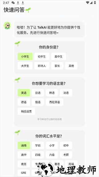 1、首先进入 TalkAI 练口语应用,根据自身情况选择身份信息与对应的词汇水平。