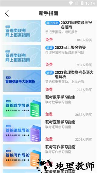 3、点击选择新手指南选项,能查看联考各科目对应的免费学习指南内容。