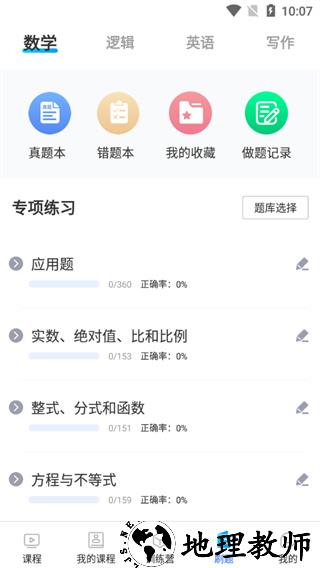 4、配备必备刷题模块,涵盖数学、逻辑、英语、写作四大科目及三大专项刷题模块,满足练习需求。