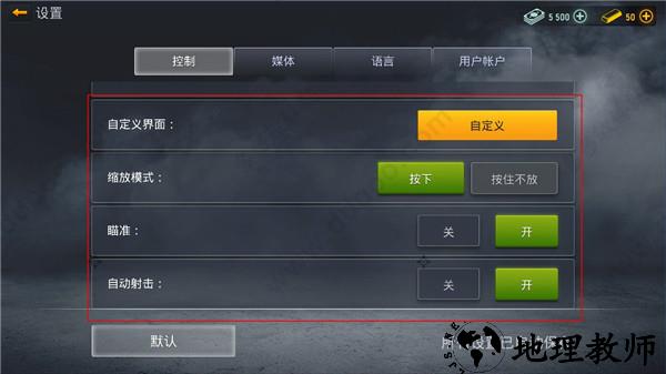 4、在“设置”-“控制”中可以对界面、缩放模式、瞄准、射击等进行设置;
