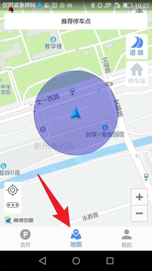 3、点击底部地图标签页,即可查看附近推荐停车点,蓝色圈范围为当前可用停车区域。