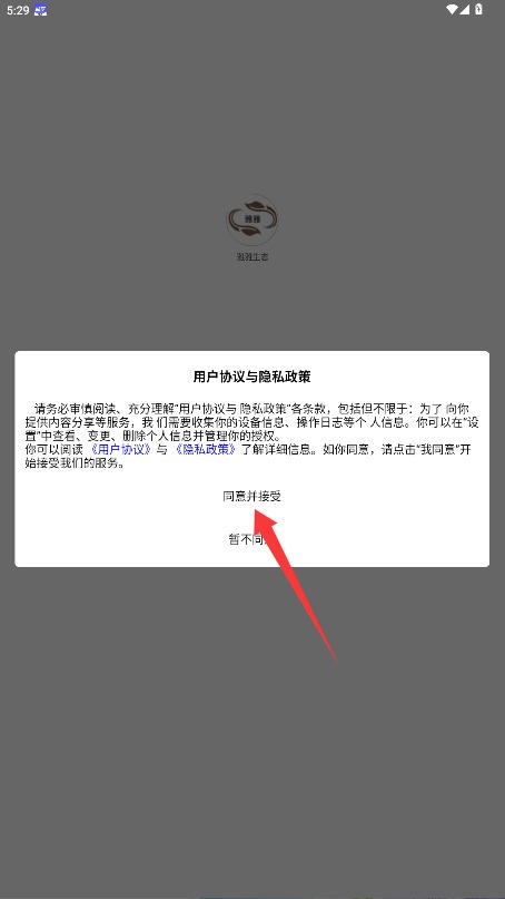 1、初次使用需阅读平台服务条款与隐私政策,确认后点击同意并接受按钮进入应用。