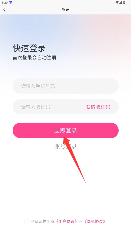 2、在登录页面输入账号和登录密码,勾选同意相关条款后点击立即登录进入应用。