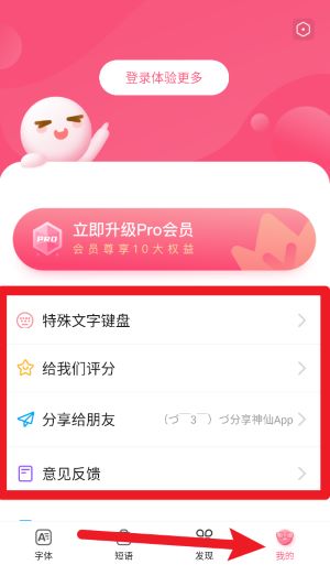 5、在我的页面中可进入设置、键盘功能、用户反馈等模块,支持会员升级和分享推广功能入口。