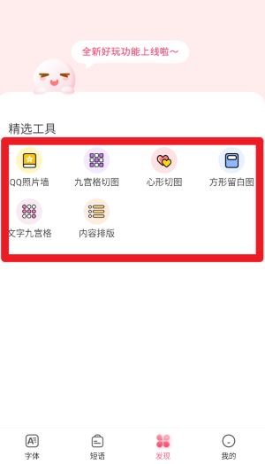 4、点击发现标签页可以使用精选工具,如文字九宫格、内容排版、心形图等图文生成实用工具。
