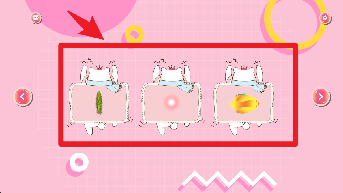 1.打开游戏后,点击屏幕上的左右箭头,可以切换不同猫咪互动玩具,如激光点、猫薄荷、金鱼等。