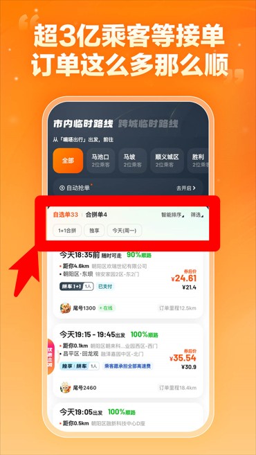 4、系统根据路线实时推送订单,支持查看待接订单和合单情况,轻松接单赚油费。