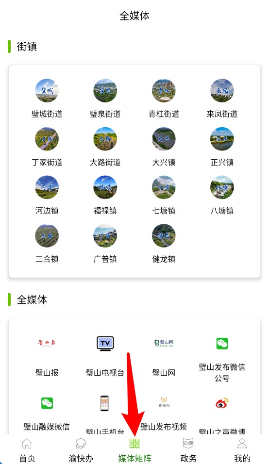 3、媒体矩阵板块集成街镇内容与本地媒体资源,方便查看多渠道新闻资讯。