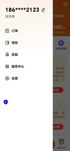 4、点击左上角头像可进入个人菜单,管理订单、钱包、奖励、服务中心等功能。