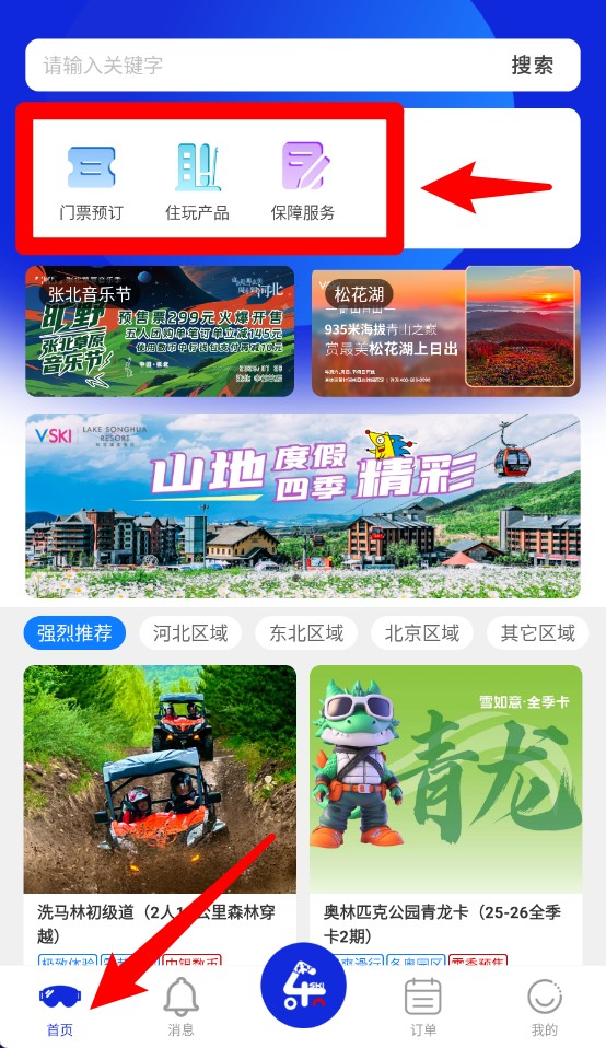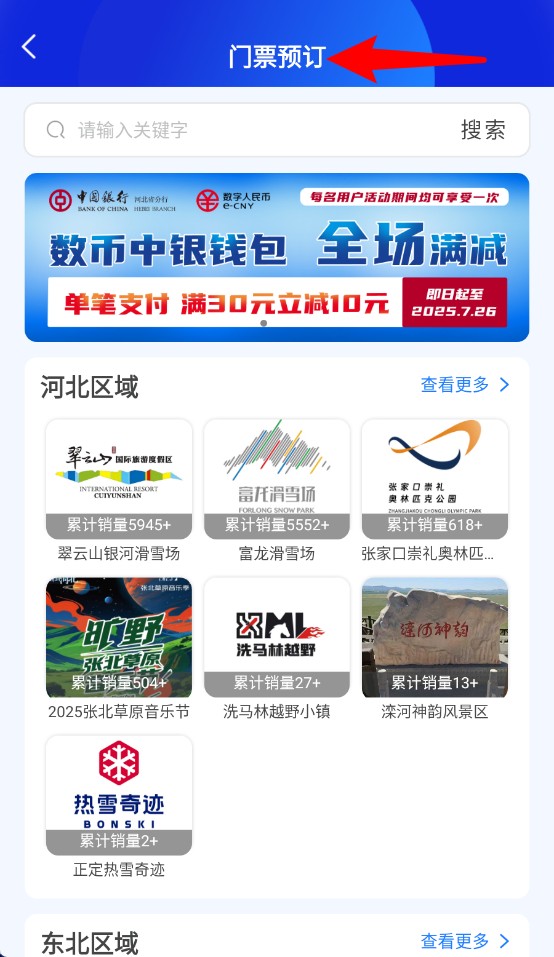 2、点击门票预订后可查看各地滑雪场与景区门票信息,支持搜索与区域分类浏览。