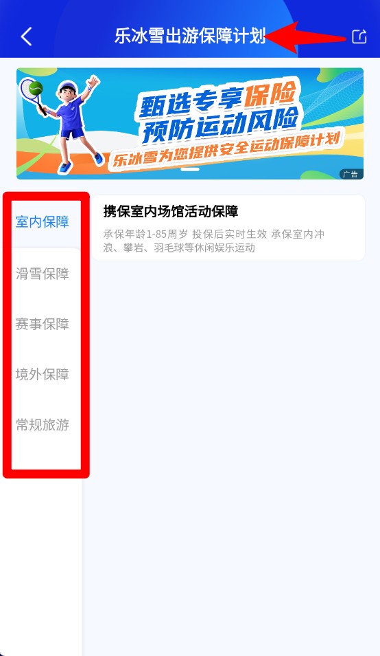 4、保障服务页可选择室内滑雪、赛事、境外与常规旅游保障,分类清楚,适用范围广。