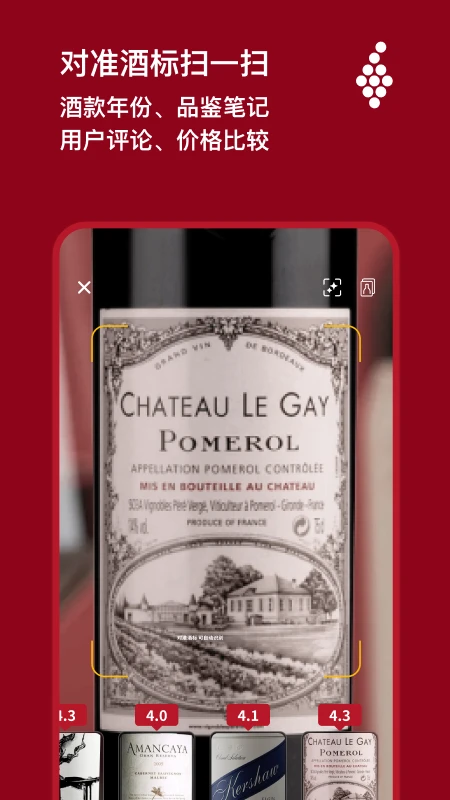 1. 拍照识酒:通过手机摄像头拍摄酒标,自动识别酒款信息,包括产地、酒庄、年份、葡萄品种等基础数据,并关联全球用户评分与品鉴记录。
