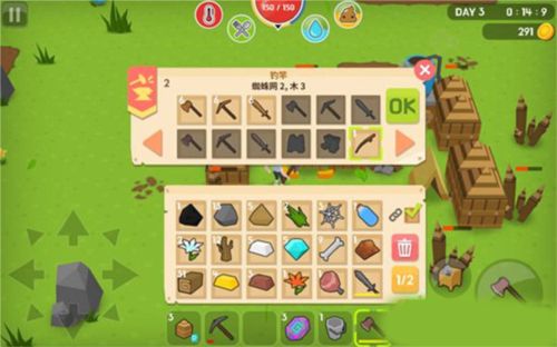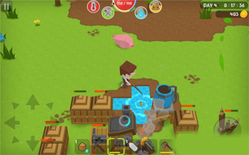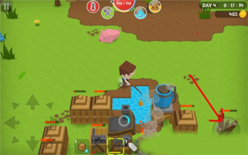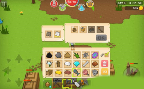 3、活过第一晚,第二天就把净水器做出来,然后需要铁块做铁桶。不然你活不过第三天早上的。净化水的方法,站在水塘边,选中铁桶,然后点右边按钮就会打水。对准净水器打开界面,按住铁桶拖到界面左边那栏,然后会自动净化。取水是两种,玻璃瓶或者铁桶,选中后,下面的【OK】亮了,点下,净化后的水就到铁桶或玻璃瓶中了。4、第三天,一定建出厕所来,不然也会死掉。